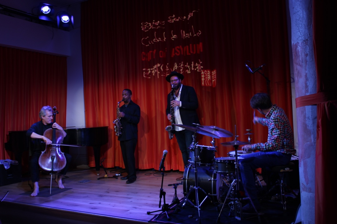 Le violoncelliste s’est même demandé : comment proposer une musique qui soit réellement de ce début de 21ème siècle ? Car celle du début du 20ème siècle, celle qui fut identifiée comme du “jazz”, a été immédiatement nouvelle et populaire, liée aux transformations d’une époque, produit de son temps : une collision heureuse entre les cultures, à l’heure de la seconde révolution industrielle, du développement des transports de masse, de la démocratisation des pratiques artistiques et instrumentales… Mais aujourd’hui, à l’ère de la mondialisation, dans ces temps post-modernes et gloutons, à quoi donc pourrait ressembler le “nouveau” ? C’est l’impossible question à laquelle ces quatre improvisateurs aux caractères marqués, tranchés et trempés, tenteront de répondre en jouant. Nul besoin de convenir de procédures de découpage et de collage, de négocier la persistance d’un discours apparemment tenu avec le droit à l’oubli inclus dans toute improvisation, de se confier des tâches et des multitâches… Jour, et se laisser porter plutôt par des questions peut-être sans réponses : comment ne pas abuser de soi-même, comment être multiple plutôt qu’unique ? Comment être durable à une époque étourdie et étourdissante ? Comment cultiver une intense petitesse à une époque bernée par la folie des grandeurs ? Quel rapport à la vitesse réinventer ? Comment ne pas contribuer à la destruction de la planète ? Aucun programme en vue. Seule la vigilance risquée du jeu et de l’invention.
