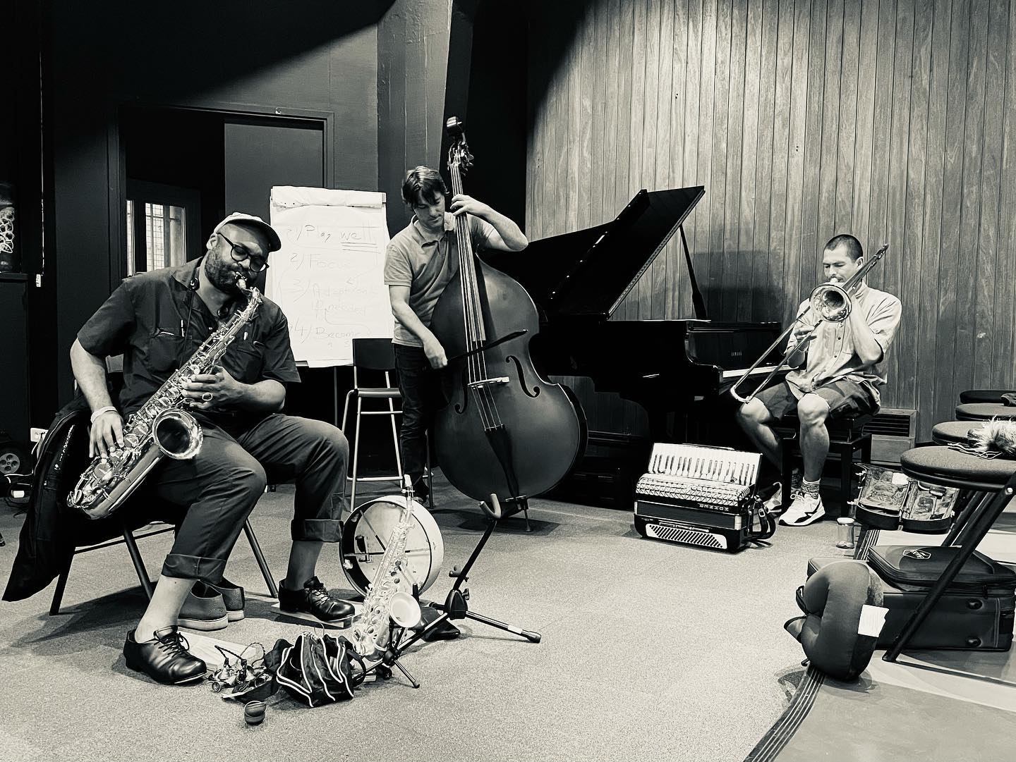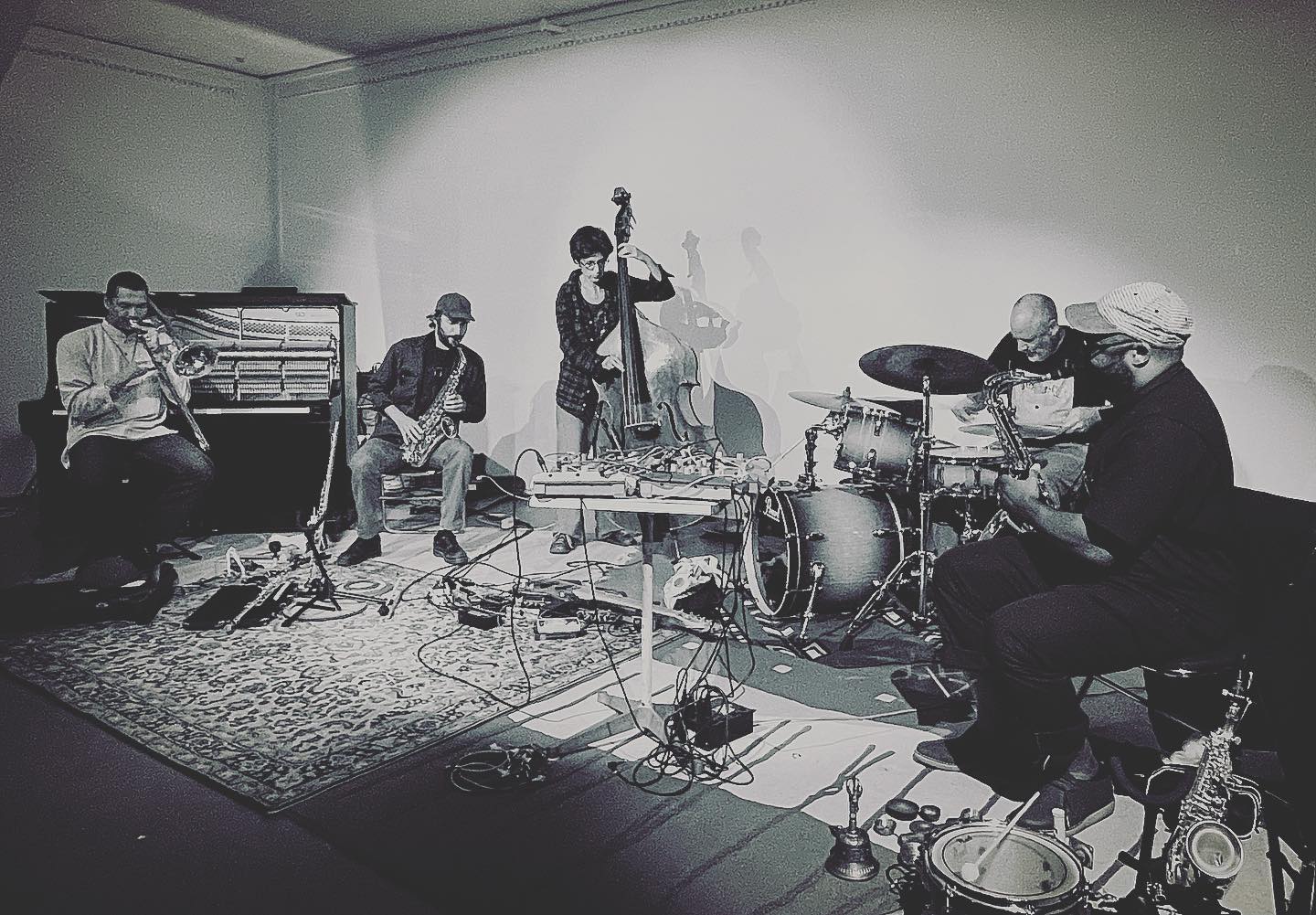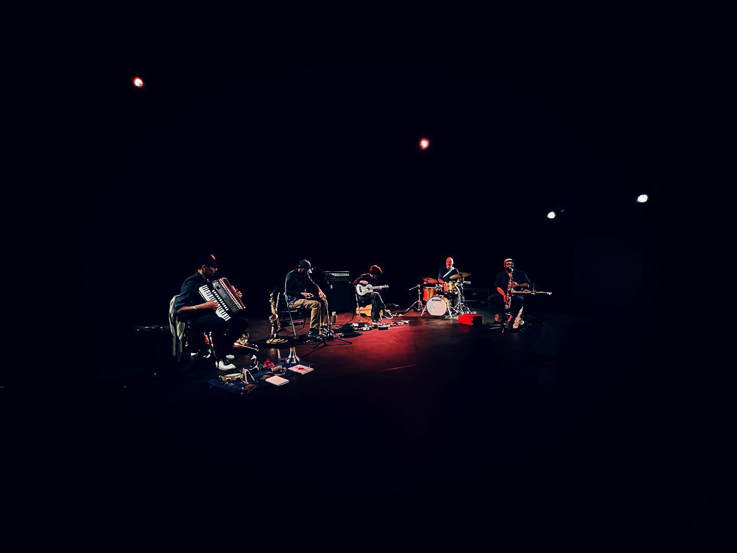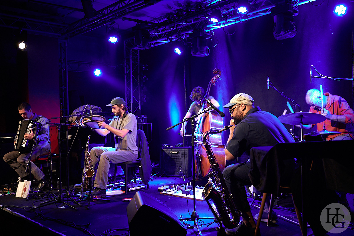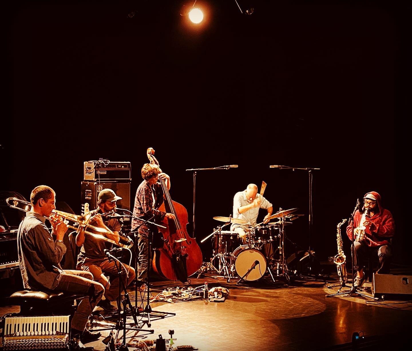 Nîmes, le 7 octobre. Au Petit Théâtre de la Placette. Soirée de subdivisions pour C.O.L. ; il sort des musiciens de partout, qui forment trio sur trio, par tirage au sort, puis un grand tentette tentaculaire et incroyablement uni. Avec le quintette : Robin Fincker au saxophone ténor, Thierry Daudé à la trompette et à la voix, Benoît Pérez à la trompette, Bernard Santacruz à la contrebasse, Samuel Silvant à la batterie… Les jeunes boulistes ont arrêté leur partie ; toutes affaires cessantes ; pour venir écouter ça.