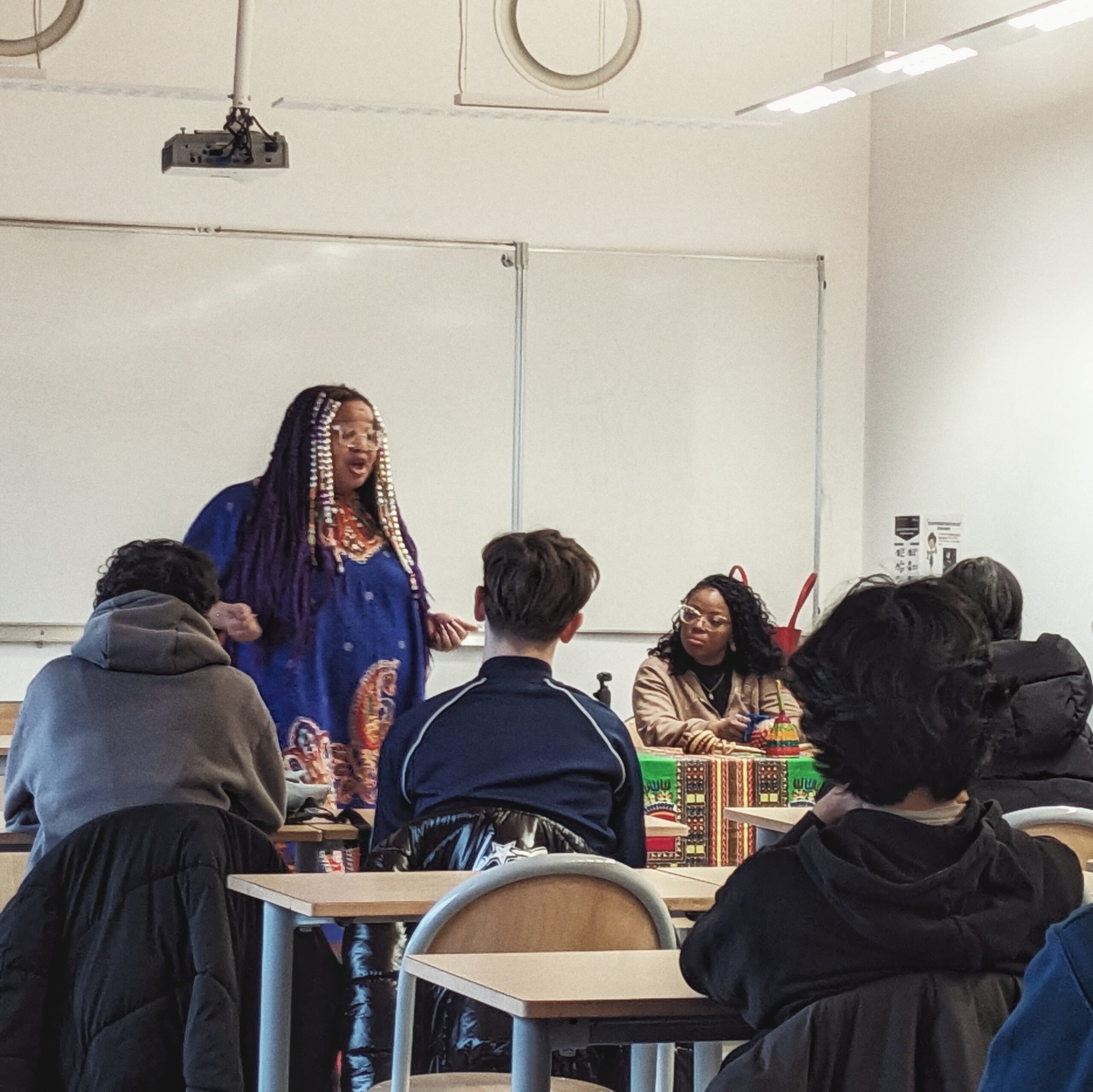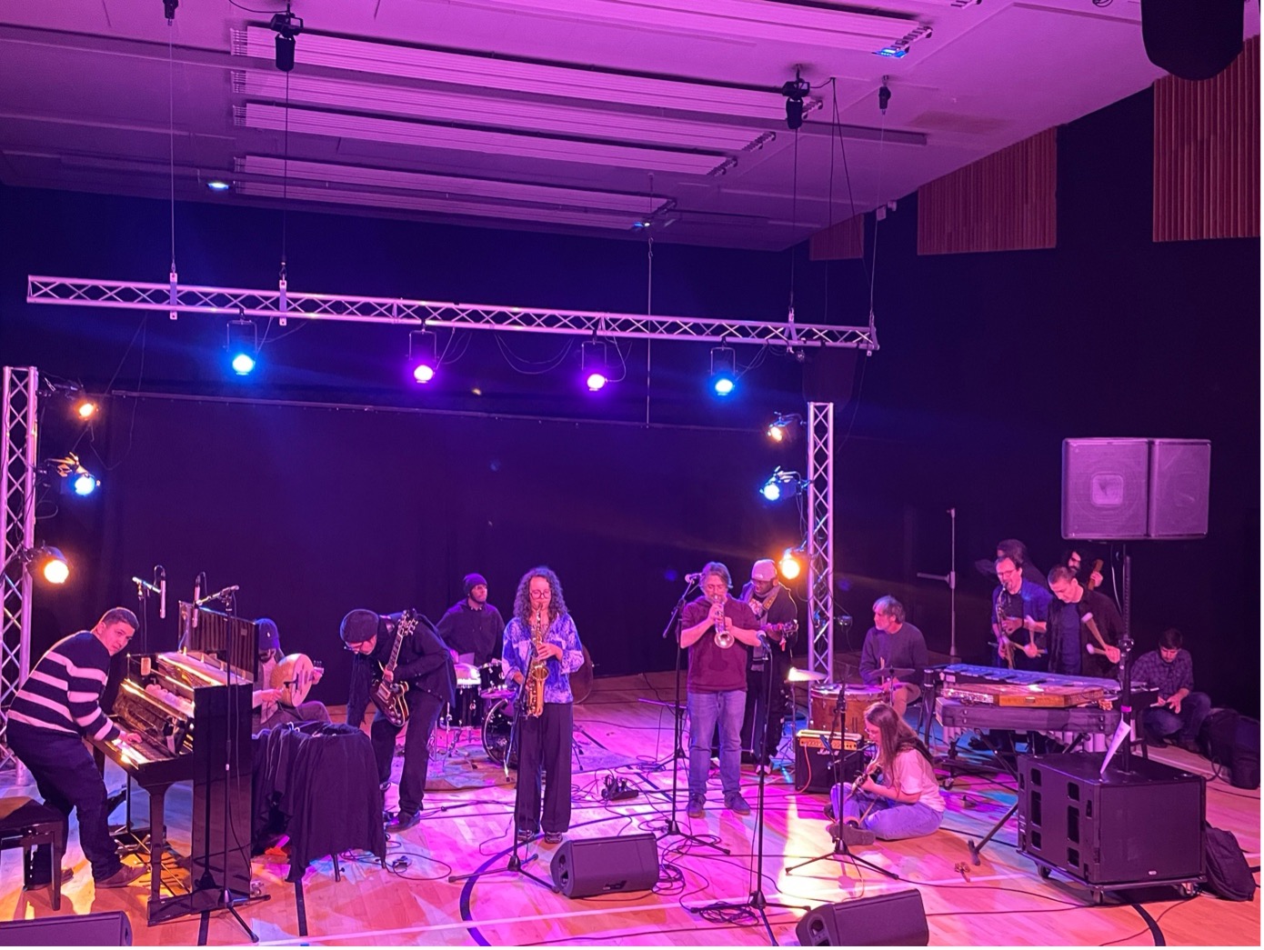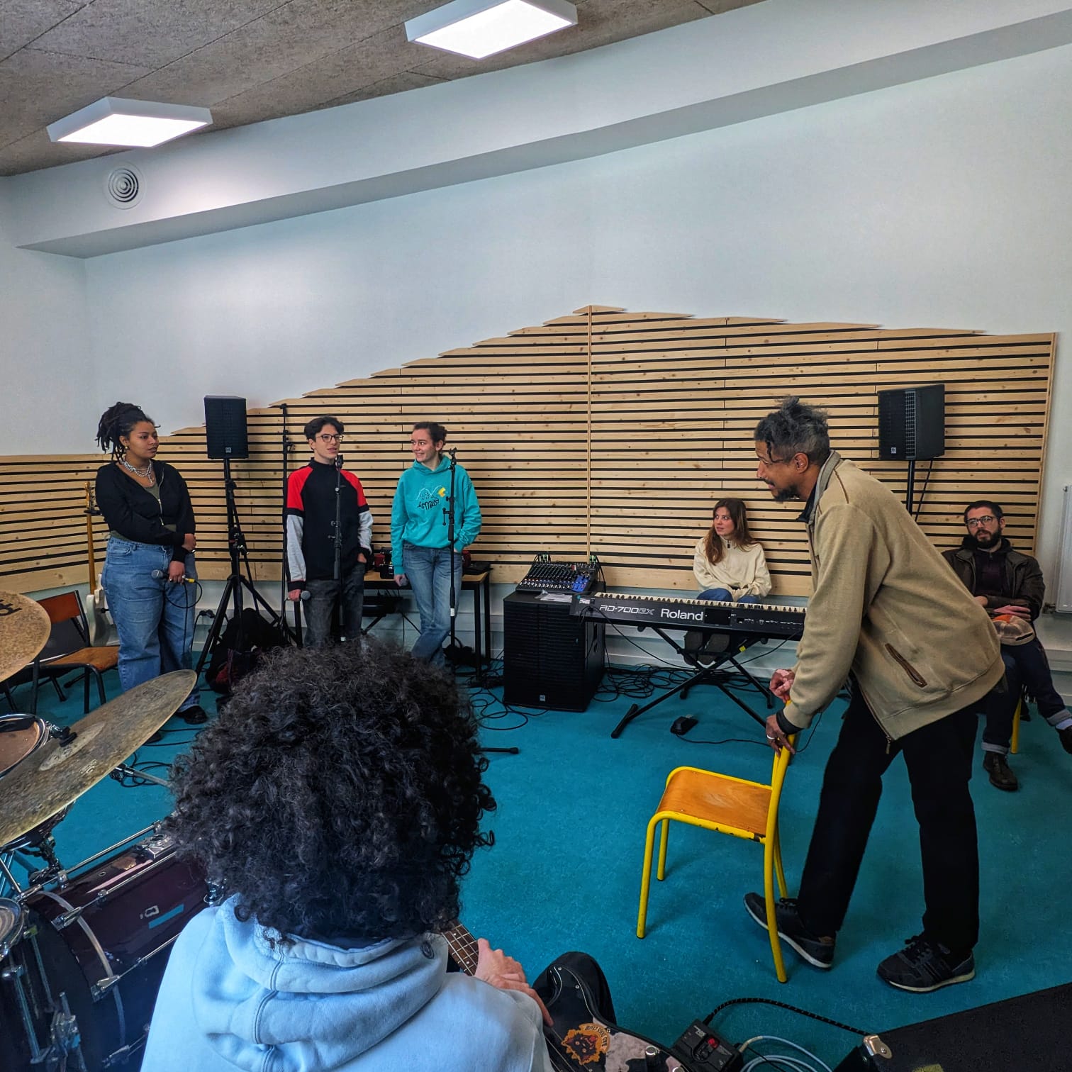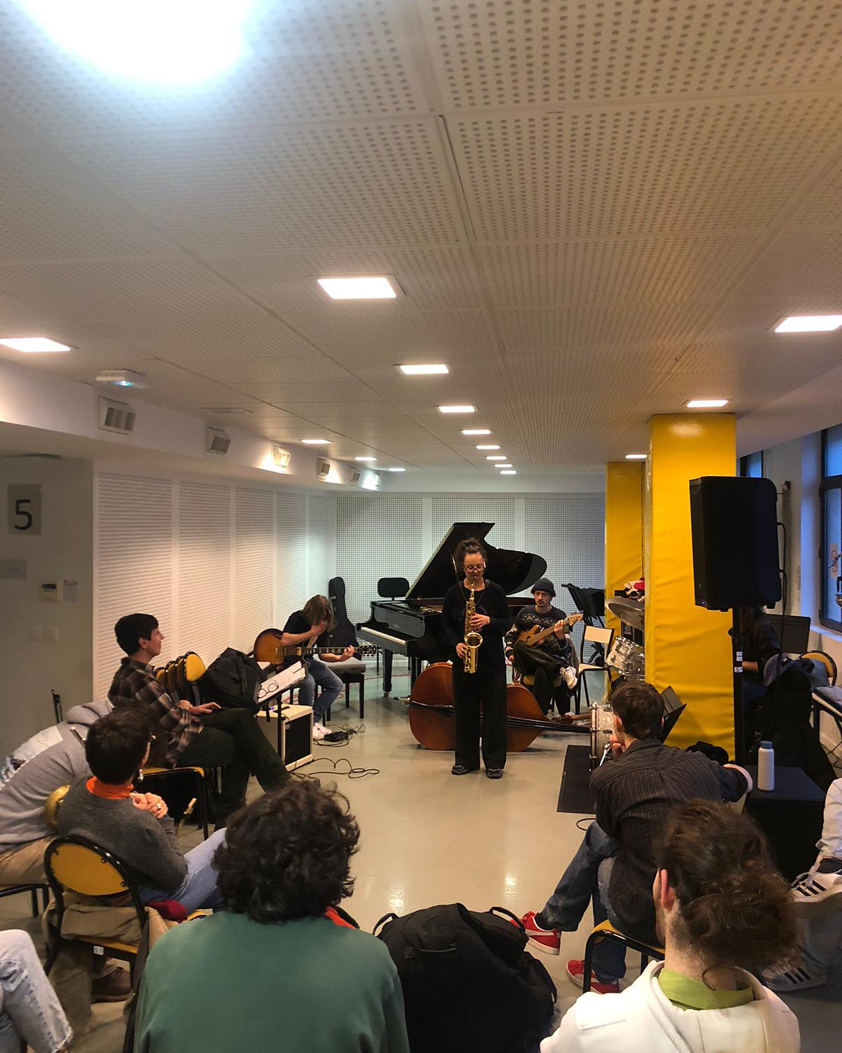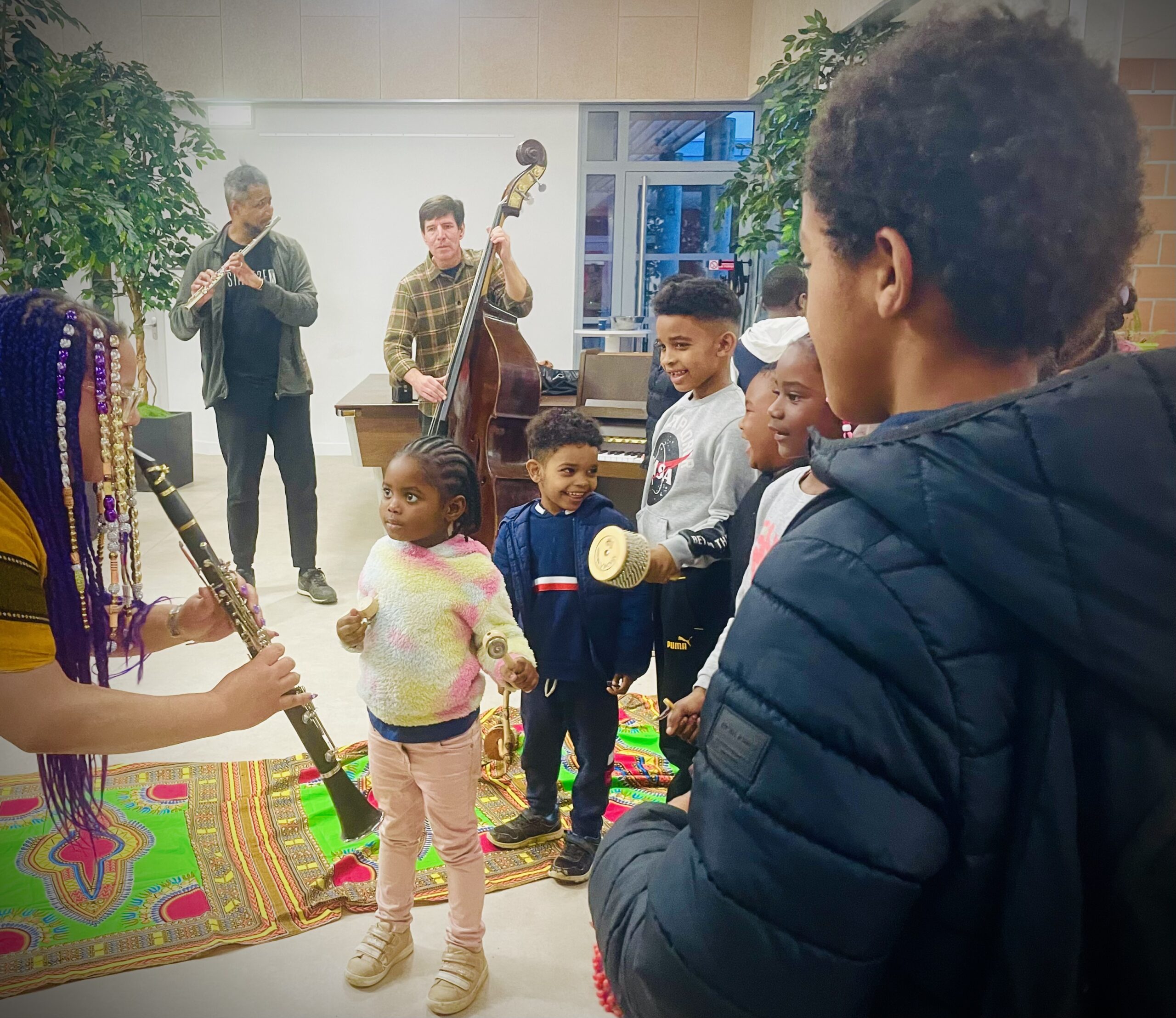 And then there were all the encounters on the fringe. Full margin. Full heart. Community Engagement. Angel Bat Dawid and Eva Supreme at the Lycée Gustave Eiffel in Gagny; Angel, Magic Malik and Richard Comte with students from the Music Department of the Université Paris 8 | Vincennes – Saint Denis, in a steam bath and a black space. Nick Macri with students from the specialized jazz cycle and preparatory classes for higher education at the Conservatoire à rayonnement régional (CRR) of Paris. From Nick and Toma Gouband with improvisers from the PIL (PoCo Improvisation Laboratoire), at Le Local socio-cultural center in Poitiers. Richard Comte and Magic Malik with music students from the arts degree program at the Université de Bretagne Occidentale (when not with students from the Lycée Fénelon in Brest). And Angel and Richard at Le Petit Salon, a day center for women with or without children in precarious situations in Toulouse. And the whole group with the children and families of the Maison de Quartier de Cantepau in Albi, music mixed with their daily lives. Her favorite show. Everywhere and all the time, and sometimes on the merry-go-round of everything possible.