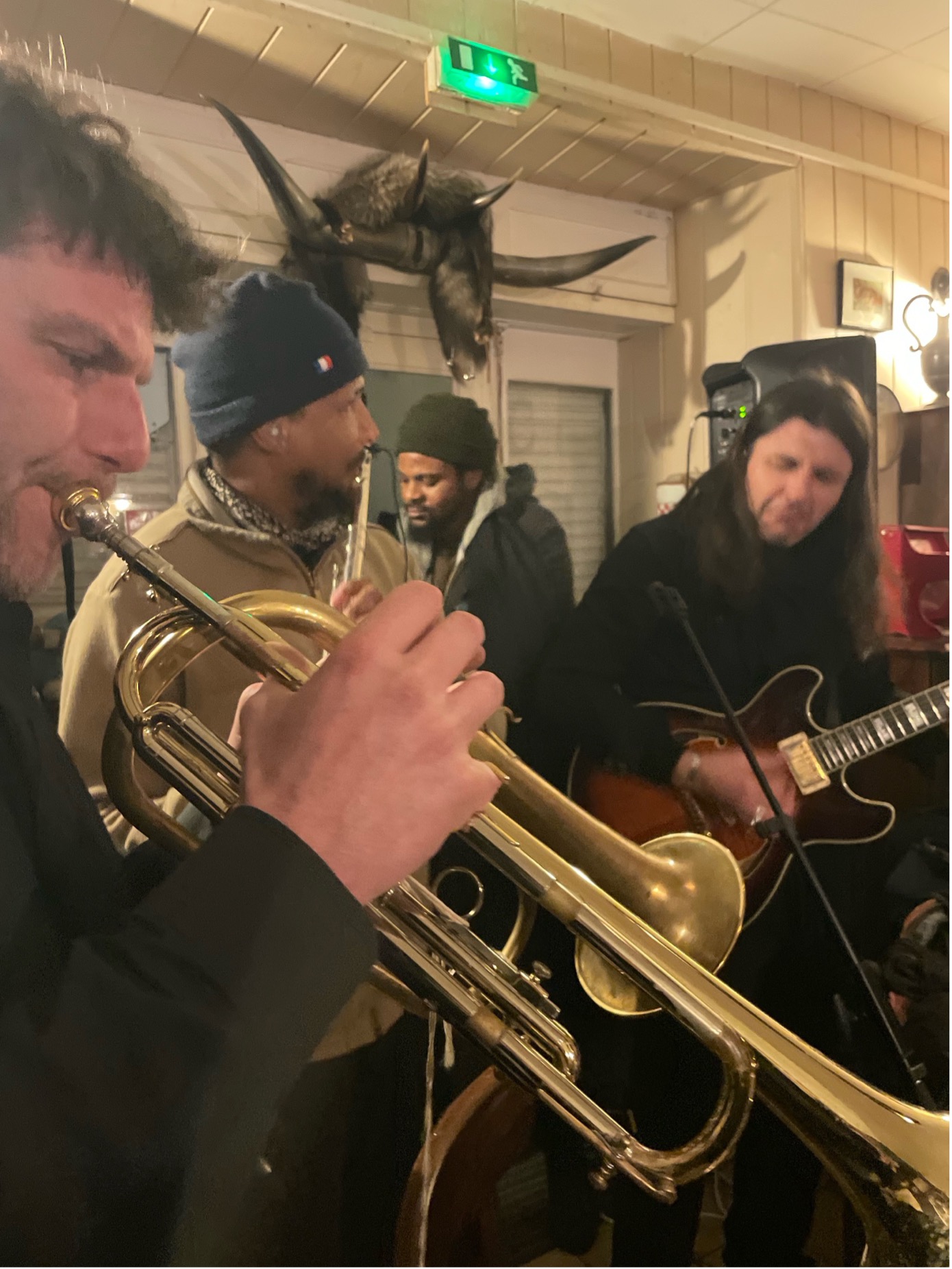 Sunday January 26, Bayonne. We move on to another bistro, despite the storm warning and the wild boars on the road. And we continue with Miles Davis, very indirectly and very involuntarily, when he “Runs the Voodoo Down”. Bastringue’s furious and generous madmen have opened wide the doors of the Bistrot du Saint-Esprit for The Bridge #2.12, and it’s a thunder of possessed voices, Angel’s, Malik’s, Richard’s, the crowd’s, wrinkling the earth’s crust. That’s all there is to it. Nick and Toma play the game of playing and thwarting everything, of experiencing the heterogeneous to the point of ecstatic tightening, to the long embrace of a propeller-driven whirlwind, and to the point of lightning strikes. There were a few lightning strikes that evening…