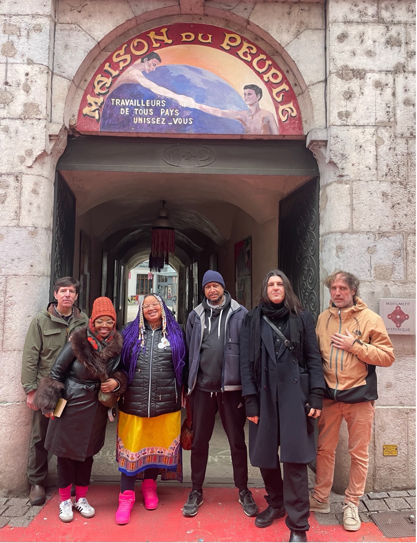 Saturday, February 1, Saint-Claude. It’s off again in the Magik School Bus, as Angel Bat Dawid has christened it, despite the double entendre displayed on the on-board screen: “Don’t let the system distract you from the traffic”. It goes without saying that at the Maison du Peuple, the music goes against the flow. It can accommodate anything, just like the old, ancestral, young workers’ cooperative where we are: general assemblies, universities, libraries, gymnasiums, wine cellars, trade union premises and a labor exchange, warehouses, printing works. But machines take care of machines and minds take care of minds, and between these two planes pass bodies, songs and melodies. Sometimes contraband. One of these melodies attracts Eva Supreme to the stage, helping the music to climb the mountain, to see the other side, to fade away. A knowledgeable member of the audience declares the band members to be members of the Shamanic Party.