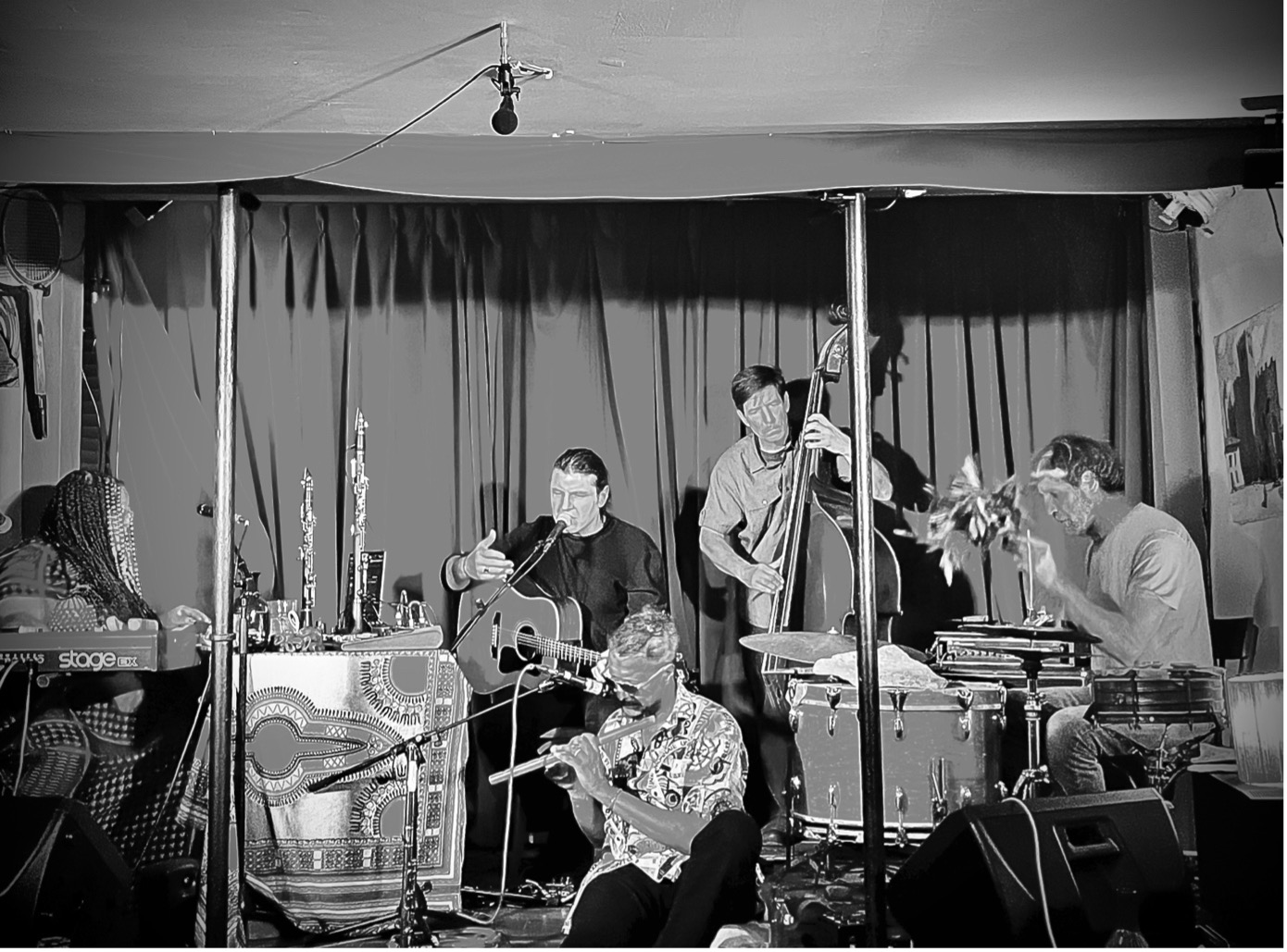 Among the world’s oldest musical instruments are the flute and the lithophone, not to mention the voice in all its forms. Among the world’s most “classical” musical instruments are the clarinet and the guitar, but these are also the instruments of so much popular music around the world. They are all here, these instruments, as they are and especially transformed, and also the immense shadow of the double bass, in this quintet or pentacle of maquisards, mavericks of sounds and exclamations and interstitial silences. Deconstructors and reconstructors.