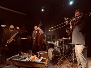 That’s crazy. And it makes perfect sense. When you listen to them you can’t hear yet, the five they already are and soon will be, a new ensemble, a new assembly, to cross The Bridge, they’re pretty clear about their intentions, without having consulted each other more than that, more than necessary. NP the drummer declares: “On paper, it looks like a standard band, or one with standard, even classic instrumentation. What does that tell us? Is it a clue as to what’s going to be played, or what won’t? Or is it a clue to what should be played, or a clue to what can’t be played, or all of the above? The only predictable thing is that there will be play. Playing with sounds, predictions, possibilities and impossibilities.” PW the pianist confirms: “I wanted a ‘classical’ jazz ensemble, to get straight to the point, to allow the instruments to play their traditional role and play a music that has found its point of balance: free jazz. Not to stop there, but rather to seek depth and exploration of the material. The power of “sound and rhythm”. The desire to find a contemporary expression in this music of almost three generations. “Ancient to the Future”, but in a kind of mise en abime of free jazz as an emancipatory and spiritual chant.” And the North Americans, for their part, like JA the trombonist, agree: “One of the great joys of playing improvised music is the new relationships that are built through sound and develop into lasting human connections. Joining a new group of musicians elicits an excitement like children on Christmas morning… Sharing this experience with new audiences, in new places, makes the many many miles travelled in airplanes and trains and buses worth it.” Like CD the double bassist: “I am thoroughly looking forward the explorations to come this October. It is always a pleasure performing with fellow musicians from The Bridge. It is an incredible opportunity to build on current musical relationships, as well as establish new ones as we explore the unknown.” Such as IP lurking in the shadows, with his Saxophone de Jouvence? To explore the unknown? Their “horizon of expectation”, ours, yours: a clear sky, a sky laden with clouds or sand, a stormy sky, a sky of marble or agate. Building relationships through a sound so heavenly and so earthly. Getting to know each other by exploring the unknown.