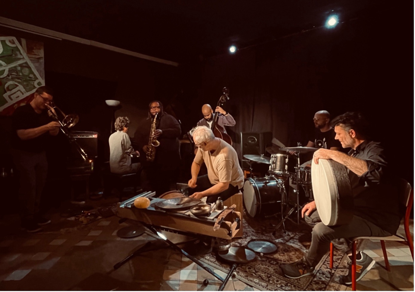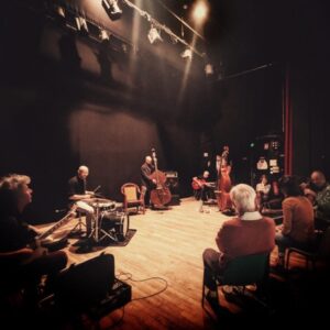 Saturday, October 11, Nîmes. On the way to the Petit Théâtre de la Placette, we saw a magpie flying under the moon in broad daylight. That, plus the card games and smoke curling from Le Rugby bar, founded by the late Michou, the “star of the neighborhood,” are good omens. Towards the impossible, as the locals say. So today we’re mixing things up. First, the trio of Paul Wacrenier (amplified thumb piano) and Nicolas Pointard (drums on dotted notes) with Jean-Pierre Jullian (percussion in the flesh and in fallow) creaks blades and jaws, then gallops away. Next, the quartet of Jeff Albert (trombone), Lenard Simpson (alto saxophone), and Christian Dillingham (double bass) with Samuel Silvant (sulfurous drums) reconstructs a melodic scene. Finally, it’s Byzantium: a cascade of ice for a seven-piece tutti, a slippery and fickle tutti.