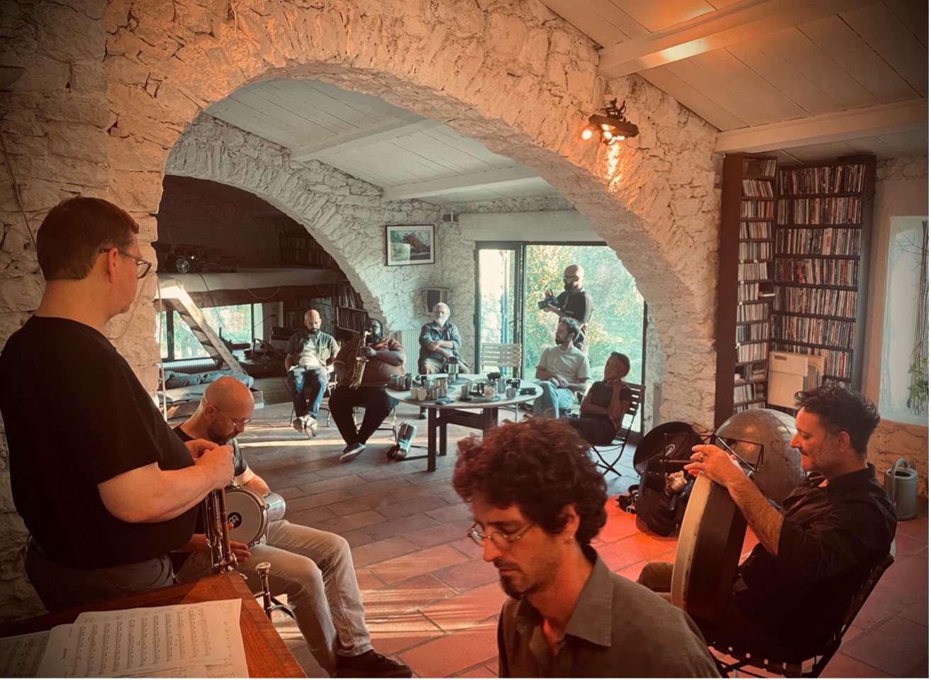 Wednesday, October 8, Poitiers. Christian Dillingham and Nicolas Pointard (joined by Paul Wacrenier) are invited early in the morning, after a night of full moon, by the improvisers of PIL (PoCo Improvisation Laboratoire) to the Le Local socio-cultural center. After a free warm-up improvisation session lasting about twenty minutes, the participants ask themselves: how can we build a common home in sound? How can we give individuality a roof over its head? Can’t we choose to build a collective house together, just as we can decide to collectively help an individual build their own house… where he or she will invite everyone! And everyone else invites themselves back for a new improvisation, a new land.