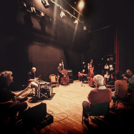 Sunday, October 12, Sotteville-lès-Rouen. By train (which allows us to compare the merits of Thelonious Monk and Hasaan Ibn Ali, or avoid a fine for disproportionate double bass, because the conductor loves music and stops her inspectors from fining us), to everything that follows and is well named, still auspicious in a rough world: at the Maison pour Tous, as part of Home Factory, for the fifth edition of the Pacific Festival. The Bridge #2.13 evolves in a tight formation and relaxed rhythm, or is it the other way around? In a relaxed formation and tight rhythm. In any case, they have become aware of this and agree (and live by) the fact that, over the course of an hour, it is rare to hear the entire quintet. Each member constantly steps aside to let the genius shine through, whether from the lamp or the music.