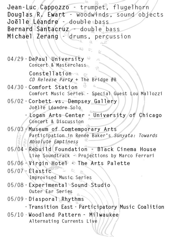 Ce quintet d’esprits libres – vivant à la croisée des chemins, cherchant à les libérer – a été réuni par des forces magnétiques en octobre 2013, pour le tout premier voyage exploratoire organisé par The Bridge en France. Côté français, le trompettiste Jean-Luc Cappozzo et les bassistes Joëlle Léandre et Bernard Santacruz. Sachant que le premier et le second ont, notamment, tous deux joué avec George Lewis. Que le second et le troisième ont, notamment, tous deux joué avec Nicole Mitchell. Que le premier et le troisième ont, notamment, tous deux joué avec Charles Gayle, dans le quintette de Denis Fournier, et dans leur propre quartet. Du côté américain, Douglas R. Ewart qui, en plus d’être un artiste visuel explosif, s’inscrit dans la lignée des multi-instrumentistes iconoclastes de l’AACM, tels que Lewis et Mitchell ; et Michael Zerang, qui a déjà fait résonner, siffler et grincer ses surfaces, ses peaux et ses métaux sur les scènes de Chicago et d’Europe.