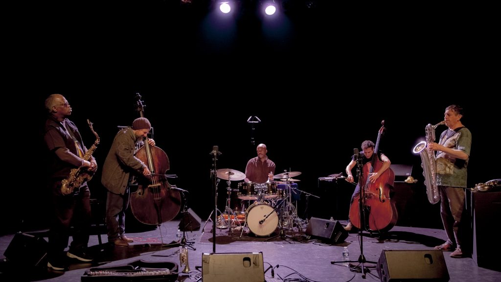 En l’occurrence, il y a de l’historique (et du légendaire) dans un “Dream Band” qui pour une fois mérite cet effronté qualificatif. En 1996, Daunik Lazro avait constitué avec Joe McPhee, compagnon de route dès le début de la décennie, le quintette Dourou, déjà complété par deux contrebassistes et un batteur. Entre eux et avec d’autres, il y eut d’enfiévrées souffleries en présence d’Evan Parker et d’André Jaume, d’échevelés encordages en présence de Raymond Boni et de Claude Tchamitchian. « Ce Bridge nous fait traverser 20 années (lumières), rapporte Lazro, pour approfondir notre aventure sonique », avec cette fois-ci les contrebassistes-conteurs que sont Joshua Abrams et Guillaume Séguron. L’un et l’autre partagent le même amour pour les formes hypnotiques comme pour les formes incertaines de la musique. Abrams dans toutes ses collaborations chicagoanes (avec Nicole Mitchell, David Boykin, Mike Reed ou Jeff Parker…), et lorsqu’il descend dans le cratère des musiques rêveuses avec Town & Country, ou lorsqu’il grimpe sur le versant des musiques éveilleuses avec Natural Information Society. Beau comme la rencontre d’El Mâalem Mahmoud Guinia et de Morton Feldman sur la contrebasse de Fred Hopkins… Séguron, précipité dans la nue par Jean-François Jenny-Clark, en bourlinguant auprès d’Anthony Ortega ou de Lionel Garcin, de Régis Huby ou de Matt Maneri, de Gerry Hemingway ou de Denis Fournier, mais aussi et surtout en questionnant inlassablement ses sources, qu’elles soient musicales et multiples, ou qu’elles soient d’ailleurs (la mémoire des Républicains espagnols, la littérature de Jorge Luis Borges, la peinture de Robert Motherwell, les photographies de Shim, de Taro ou de Capa…). Joshua Abrams et Chad Taylor, qui alternent contrebasse et batterie avec guembri et mbira, se sont rencontrés lors des jam-sessions du dimanche soir, au Velvet Lounge de Fred Anderson, à Chicago. Ils y formèrent même un trio avec Matana Roberts, avant que le batteur ne parte pour New York où son crible de rythmes cliquetants et voltigeurs a fourni une horlogerie de fulgurances et de papillonnements aux formations de Cooper-Moore, de Jemeel Moondoc ou de Marc Ribot, parallèlement au Chicago Underground dont il règle toujours les mouvements avec Rob Mazurek.