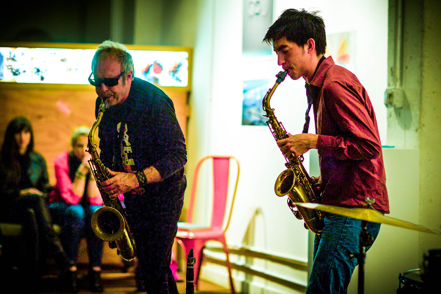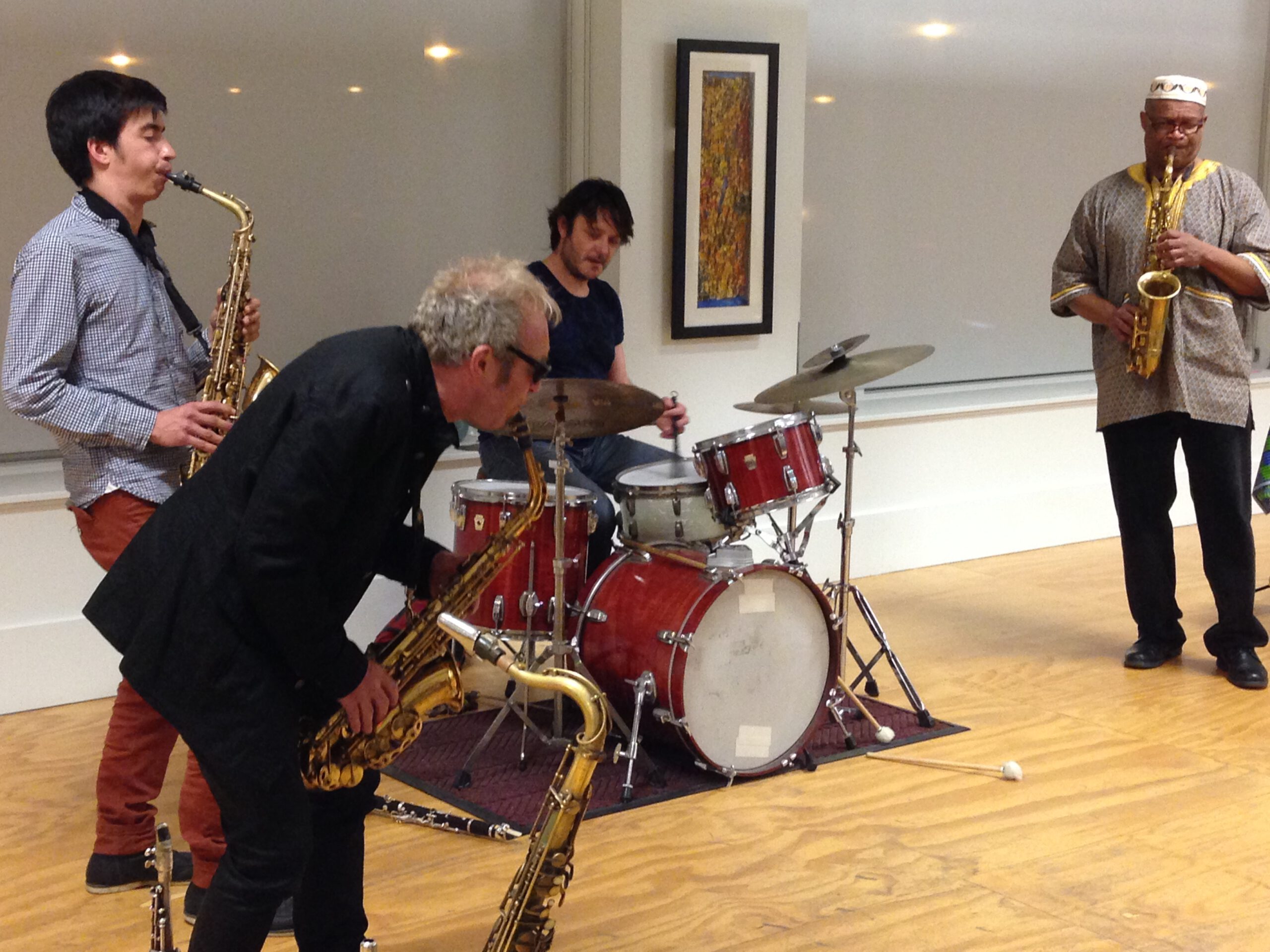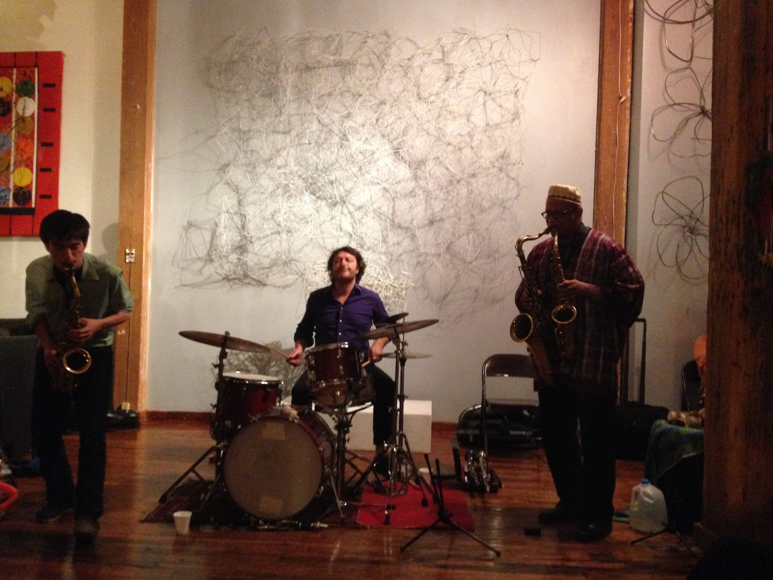 Chez Candace, dans l’après-midi, Antonin-Tri Hoang et Samuel Silvant ont écouté John Coltrane sur le pas de la porte, face au jardin et face au cosmos. Chez Kahil El’Zabar, au CoLab Space (312 N. Carpenter St.), quelques heures plus tard, encerclé par les fresques à la fois géométriques et tachistes du maître de maison, parmi les cintres et les tringles courbés et recourbés en sculptures de Lucy Slivinski, sous le regard vitreux de masques africains lustrés par les énergies, devant un parterre de friends & neighbours dont Hamiet Bluiett en convalescence, Hoang s’échauffe en interprétant The Bridge. Au signal, et au soprano, Dawkins s’emballe incontinent, concassant ses saillies, tandis que Hoang et Williams dilatent leurs altos comme des pupilles. L’un divague, les autres divulguent. Sans perdre de temps, sans permettre à la pression de retomber, Dawkins s’empare de son alto comme d’une pince coupante pour trancher dans le vif avec l’intrépide Williams. Hoang n’est pas longtemps en reste et les trois saxophonistes se portent au pinacle et s’écharpent avec voracité. Il réussit à prélever un tison de cette fournaise, qu’il décolore subtilement à la première accalmie venue, alors que Dawkins, inarrêtable, relance la rotative de ses deux saxophones. Après cet essorage, la musique repart au ralenti, dans les bruitages les plus minces, sous le couvert d’une sobre clarinette à la dérobée. Dawkins dégaine alors la sienne, de clarinette, et piétine quelques plates-bandes. Williams passe au soprano. On joue à perdre et à retrouver l’équilibre, à chanceler et à regrimper. Le troisième morceau imite une boîte à musique : Dawkins est au ténor osseux, Hoang à l’alto et aux becs dont il se sert comme de loupes à sons, Williams rapetisse au piano à pouces, Silvant choque ses cymbales. Bluiett s’est redressé pour mieux observer l’action, notamment les triturations d’Antonin-Tri Hoang. Pendant la pause, d’ailleurs, il déballe lentement mais sûrement son saxophone baryton, installe sa chaise sur la scène. À la reprise, c’est de nouveau l’escalade, et de nouveau une charge de Dawkins, comme pour accaparer leur illustre invité. Tandis que Hoang et Williams lignifient, Bluiett charpente et épaissit. Pas d’autre recours après ces embardées qu’un débrayage, durant lequel le baryton demande à haute voix : « You don’t play ? What are you gonna do ? ». Reprise de l’activité et imbrications des quatre saxophonistes, en une inévitable évocation du World Saxophone Quartet, dont s’extrait Williams soutenu par Bluiett qui l’aide à se désintégrer en plein vol. On n’entend plus que des rafales de vent, et Samuel Silvant qui bat à tout rompre. Après le concert, Bluiett remballe lentement mais sûrement son saxophone baryton. Cette fois-ci, on s’attarde avec les convives. Mars Williams raconte sa vie sur la route avec les Psychedelic Furs, alors que Kahil El’Zabar prépare le pop-corn.