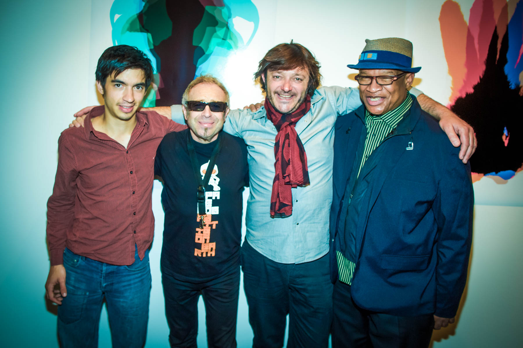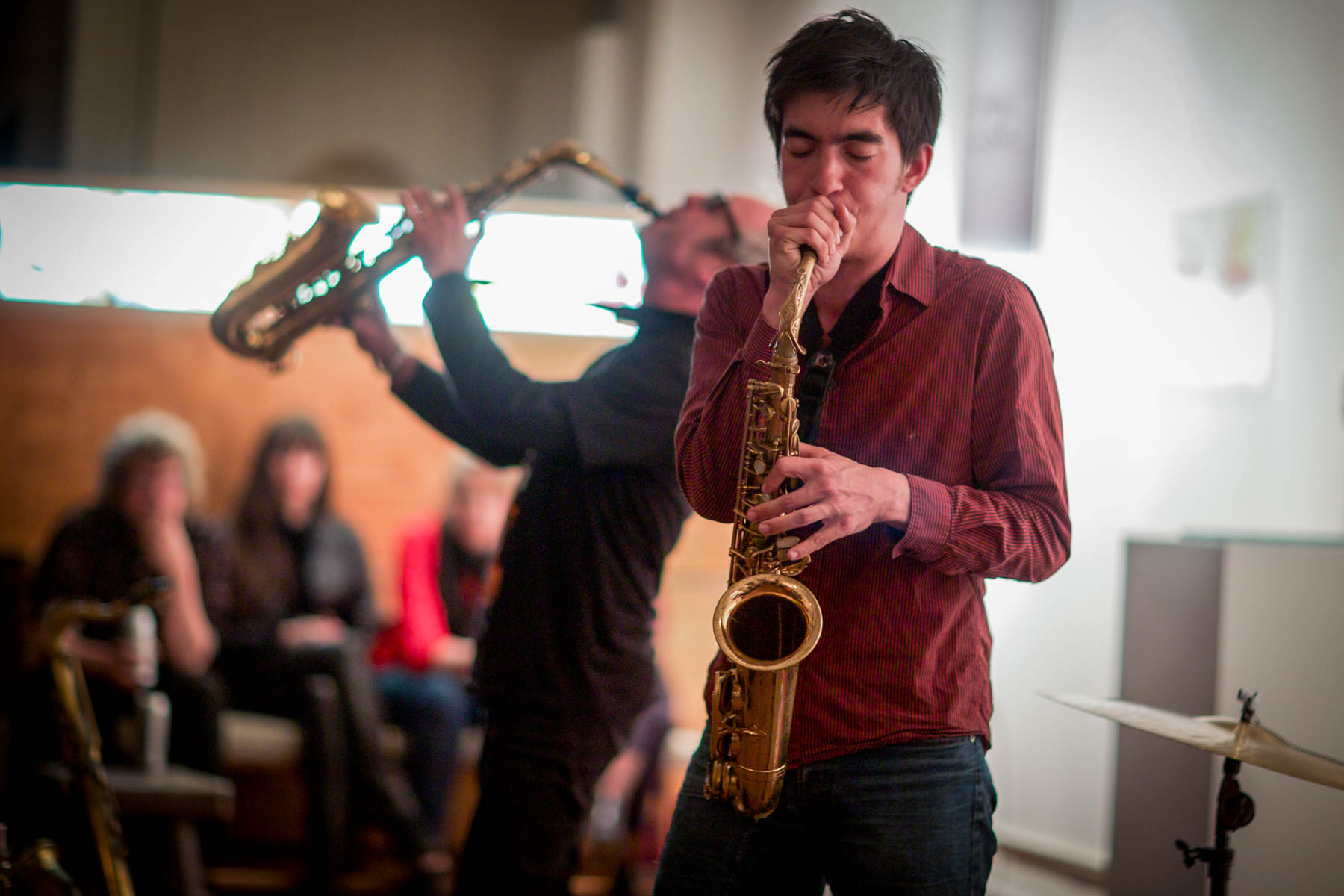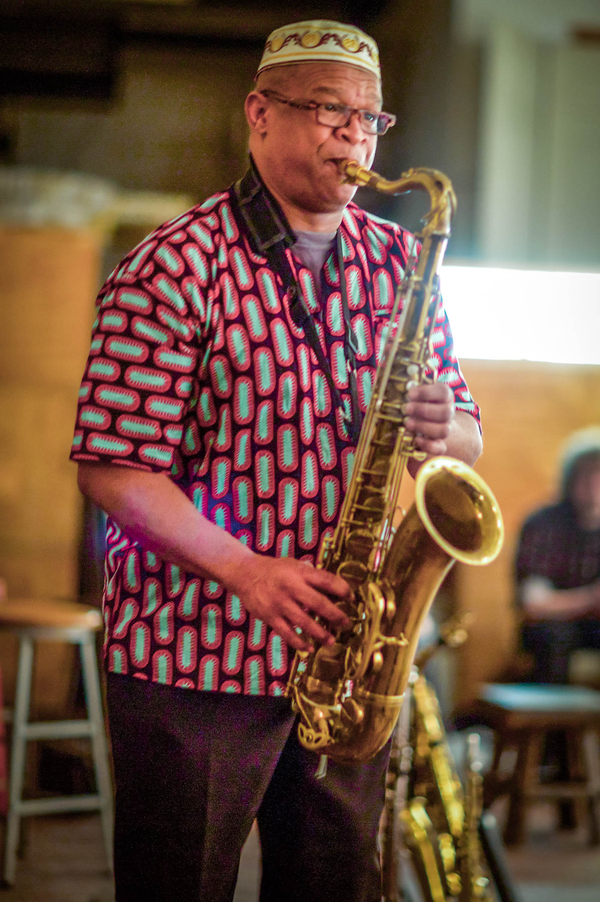 Chez Candace, dans l’après-midi, Antonin-Tri Hoang et Samuel Silvant ont écouté John Coltrane sur le pas de la porte, face au jardin et face au cosmos. Chez Kahil El’Zabar, au CoLab Space (312 N. Carpenter St.), quelques heures plus tard, encerclé par les fresques à la fois géométriques et tachistes du maître de maison, parmi les cintres et les tringles courbés et recourbés en sculptures de Lucy Slivinski, sous le regard vitreux de masques africains lustrés par les énergies, devant un parterre de friends & neighbours dont Hamiet Bluiett en convalescence, Hoang s’échauffe en interprétant The Bridge. Au signal, et au soprano, Dawkins s’emballe incontinent, concassant ses saillies, tandis que Hoang et Williams dilatent leurs altos comme des pupilles. L’un divague, les autres divulguent. Sans perdre de temps, sans permettre à la pression de retomber, Dawkins s’empare de son alto comme d’une pince coupante pour trancher dans le vif avec l’intrépide Williams. Hoang n’est pas longtemps en reste et les trois saxophonistes se portent au pinacle et s’écharpent avec voracité. Il réussit à prélever un tison de cette fournaise, qu’il décolore subtilement à la première accalmie venue, alors que Dawkins, inarrêtable, relance la rotative de ses deux saxophones. Après cet essorage, la musique repart au ralenti, dans les bruitages les plus minces, sous le couvert d’une sobre clarinette à la dérobée. Dawkins dégaine alors la sienne, de clarinette, et piétine quelques plates-bandes. Williams passe au soprano. On joue à perdre et à retrouver l’équilibre, à chanceler et à regrimper. Le troisième morceau imite une boîte à musique : Dawkins est au ténor osseux, Hoang à l’alto et aux becs dont il se sert comme de loupes à sons, Williams rapetisse au piano à pouces, Silvant choque ses cymbales. Bluiett s’est redressé pour mieux observer l’action, notamment les triturations d’Antonin-Tri Hoang. Pendant la pause, d’ailleurs, il déballe lentement mais sûrement son saxophone baryton, installe sa chaise sur la scène. À la reprise, c’est de nouveau l’escalade, et de nouveau une charge de Dawkins, comme pour accaparer leur illustre invité. Tandis que Hoang et Williams lignifient, Bluiett charpente et épaissit. Pas d’autre recours après ces embardées qu’un débrayage, durant lequel le baryton demande à haute voix : « You don’t play ? What are you gonna do ? ». Reprise de l’activité et imbrications des quatre saxophonistes, en une inévitable évocation du World Saxophone Quartet, dont s’extrait Williams soutenu par Bluiett qui l’aide à se désintégrer en plein vol. On n’entend plus que des rafales de vent, et Samuel Silvant qui bat à tout rompre. Après le concert, Bluiett remballe lentement mais sûrement son saxophone baryton. Cette fois-ci, on s’attarde avec les convives. Mars Williams raconte sa vie sur la route avec les Psychedelic Furs, alors que Kahil El’Zabar prépare le pop-corn.