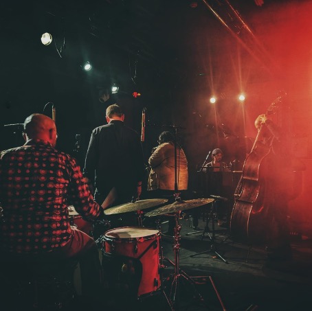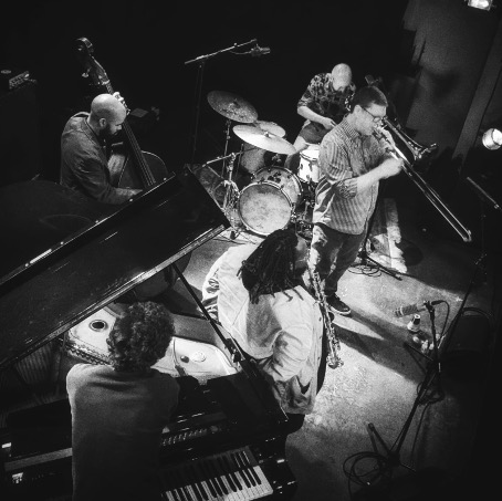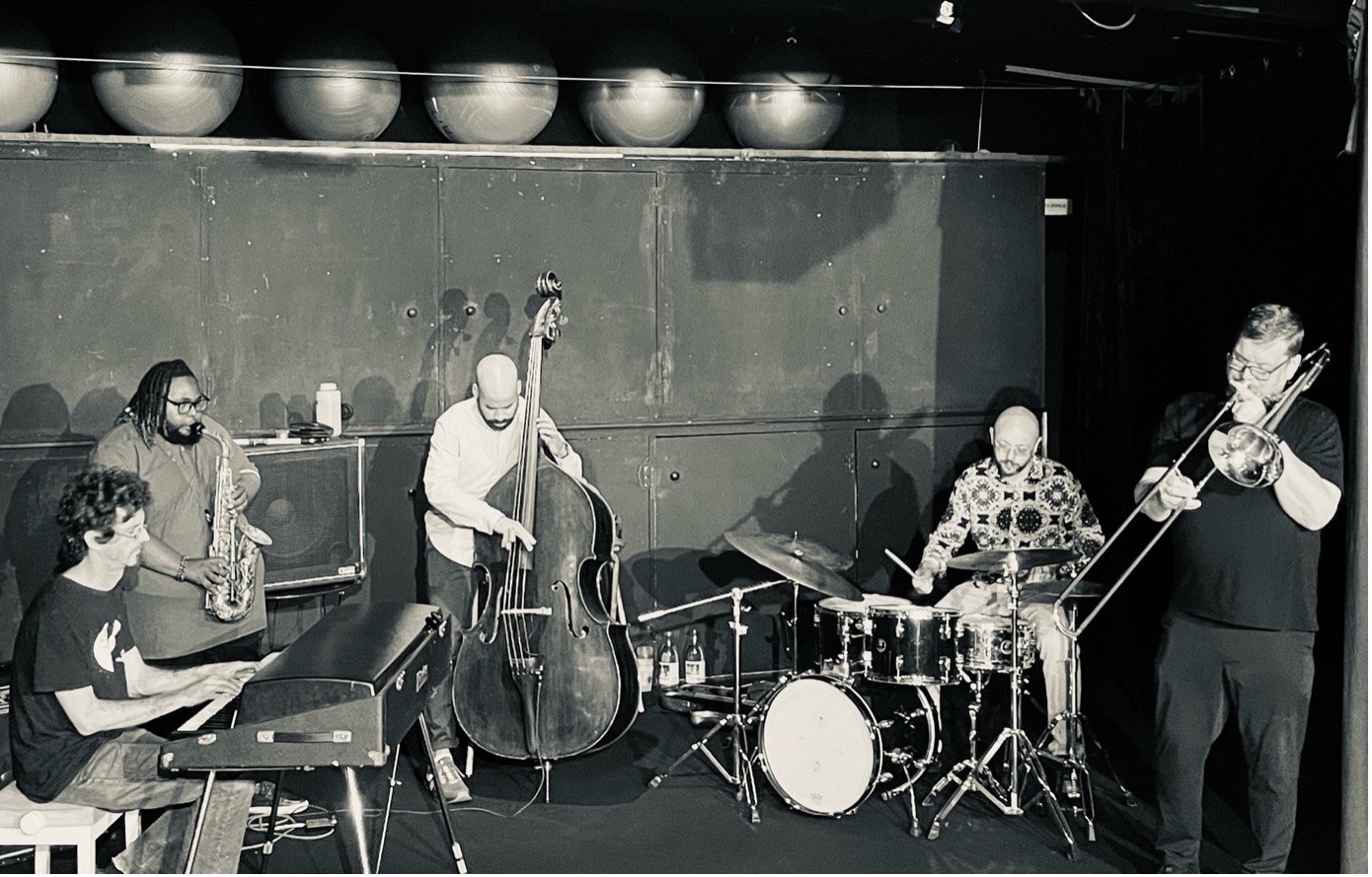 Dimanche 12 octobre, Sotteville-lès-Rouen. Par train (ce qui permet notamment de comparer les mérites de Thelonious Monk et d’Hasaan Ibn Ali, ou d’éviter une amende pour contrebasse disproportionnée, parce que la cheffe de bord aime la musique et retient ses contrôleurs de nous verbaliser), vers tout ce qui s’enchaîne et qui est bien nommé, de bonne augure encore dans un monde mal léché : à la Maison pour Tous, dans le cadre de Home Factory, pour la cinquième édition du Pacific Festival. The Bridge # 2.13 évolue en formation resserrée et en rythmique relâchée, à moins que ce ne soit l’inverse ? En formation relâchée et en rythmique resserrée. Quoi qu’il en soit ils en ont pris conscience, ils sont d’accord pour dire (et pour vivre) que, sur une heure, il est rare d’entendre le quintette au complet. Chacun s’efface constamment pour, de la lampe ou de la musique, faire sortir le génie.