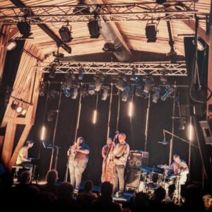 Mardi 7 octobre, Poitiers. Deuxième étape du voyage exploratoire au Confort Moderne, grâce à l’équipe de Nage Libre. En équilibre sur une corde raide, les cinq trapézistes avancent à la chaîne après avoir pratiqué l’art de la courte échelle.. Le quintette est plus souvent un duo, ou un trio, ou un quartette, qu’autre chose, et chacun de leur silence est éloquent comme un animal sauvage. Ils pétrissent des boules de bruits, de bruissements, jusqu’à ce qu’un gros rocher dévale la pente herbeuse de la musique dans une traîne de petits cailloux. Les petits cailloux de Lenard, les petits cailloux de Jeff, les petits cailloux de Paul…