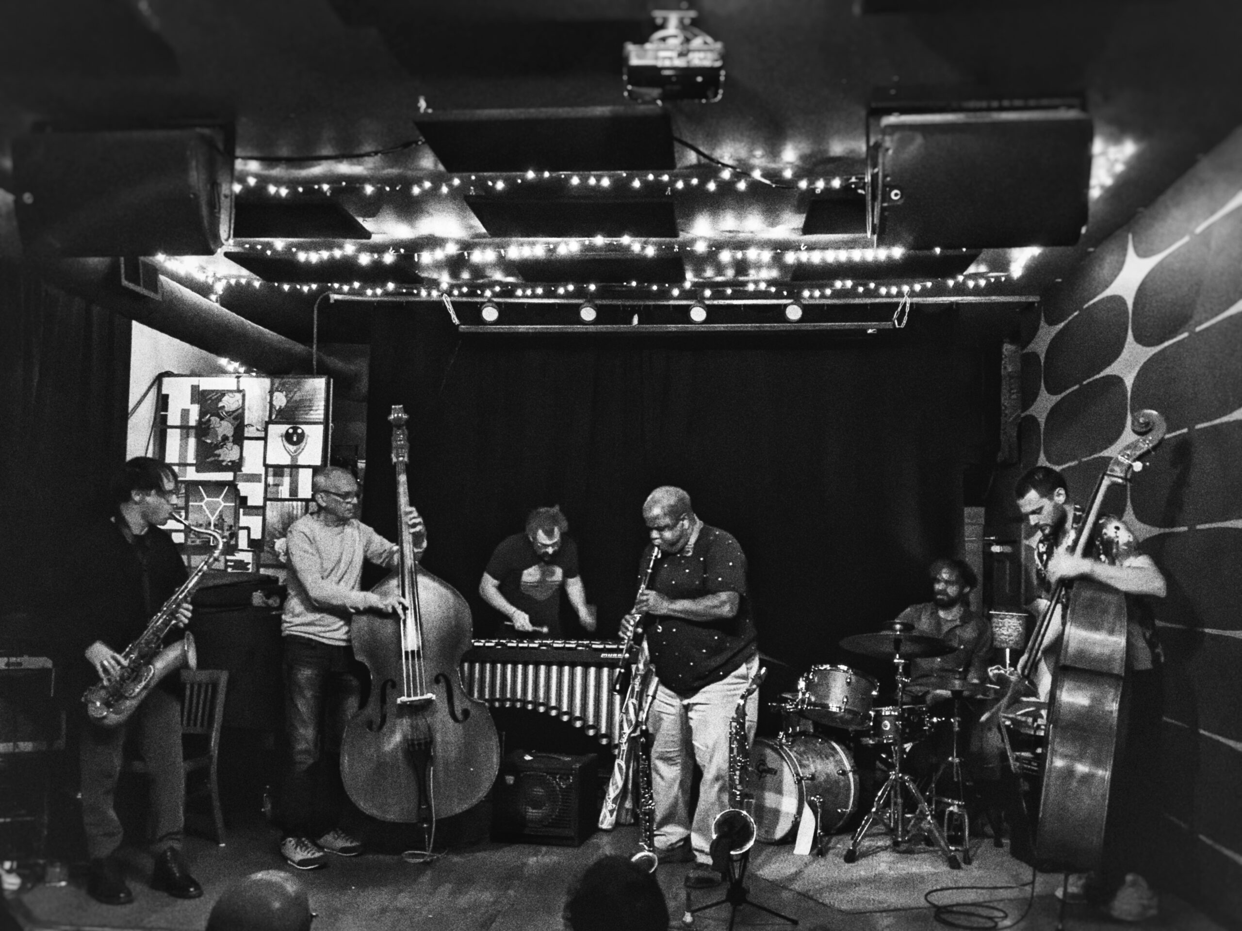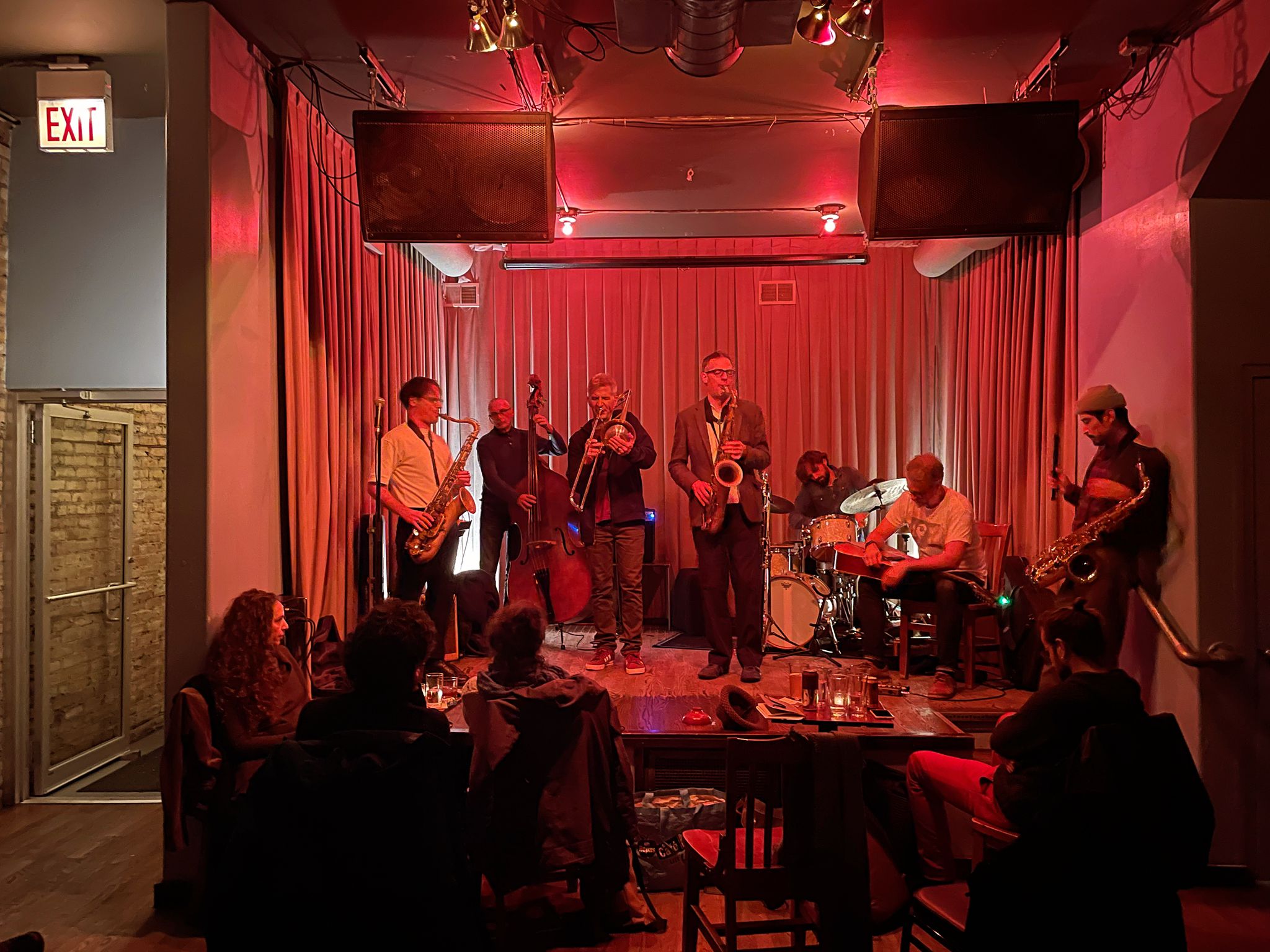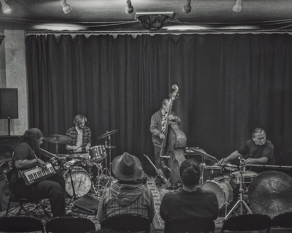 8 novembre, Relax Attack Series at The Whistler. « Everything is spirit », nous a précisé dans l’après-midi un Indien Choctaw et Navajo, à l’American Indian Center. Les esprits se sont vite échauffés dans la salle, le cube écarlate, où Keefe Jackson (saxophone ténor, clarinette basse), Xris Esp (saxophone ténor, flûte, percussions), Jeb Bishop (trombone), Tim Stine (guitare) et Bernard Santacruz (contrebasse) sont les compagnons de route de Queen B. et du Z. Ce sont eux qui avalent la route, eux qui lacent leurs lignes droites et font ensemble collection de virages.